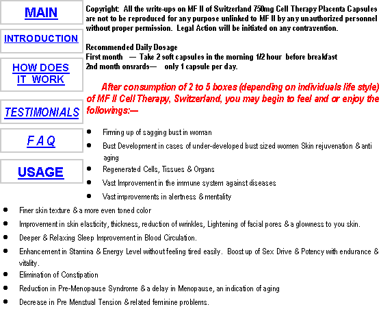 The vast difference between MF II of Switzerland 750mg soft capsules & a number of other nutritional supplements for the face in the market today:-- MF II of Switzerland Livelised 'Cell Therapy' not just improves your skin or face appearance unlike the normal nutrition supplements. It also revitalises & rejuvenates your whole face & body to give you the real younger healthier look!